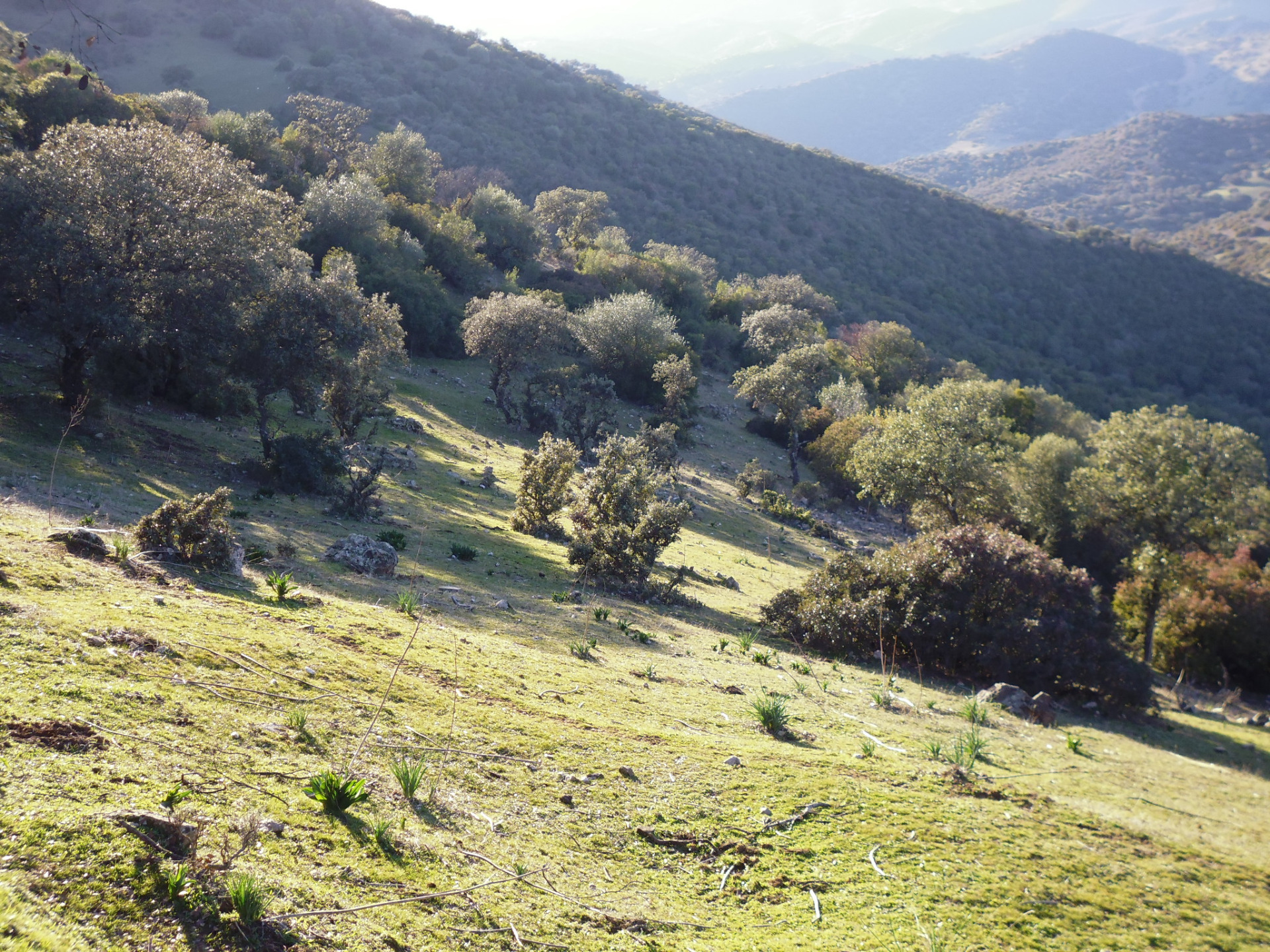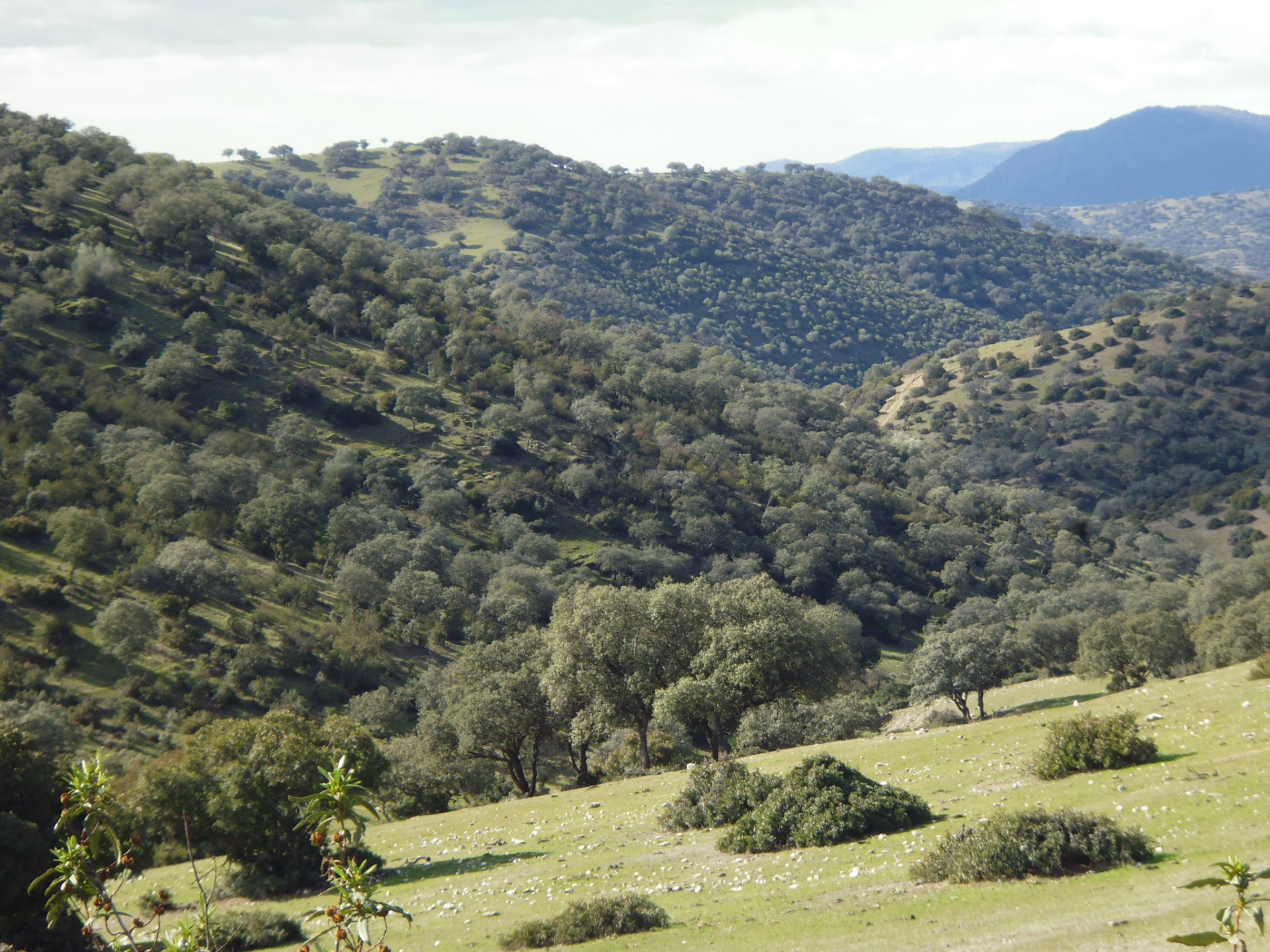Destacan los bosques de encinas. Acompañando a estos encinares, existen otras comunidades de matorrales (monte mediterráneo), como jarales, madroñales y cantuesales. En las solanas más térmicas y cálidas abundan los lentiscares, acompañados de coscojas, encinas y jaras. Forman ecosistemas abiertos mezclando manchas de matorral, alternadas con claros de pastizal. En los barrancos más umbríos, se crean espesuras de arbolado con matorrales altos (bosque mediterráneo) donde predominan las encinas, junto con madroños, olivillas y jaras. Ambos ecosistemas vegetales son muy querenciosos para el ganado y la fauna silvestre en diversas épocas del año según la climatología. Los pastos típicos son los majadales y vallicares, que junto con la bellota, nutren a la fauna y a la ganadería.